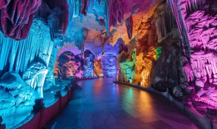 In Guilin, China, you’ll find the amazing Reed Flute Cave. It’s called the “Palace of the Natural Arts.” This cave shows us the incredible beauty the Earth hides. With its unique rock shapes and bright colors, the cave is like a beautiful piece of artwork.
